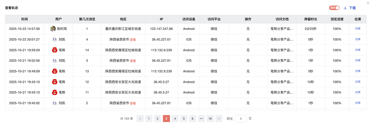 谁、几点、看了几页、用了什么设备 —— 实时推送到你微信,还能一键导出 Excel。