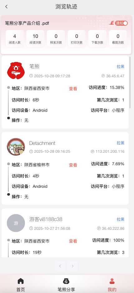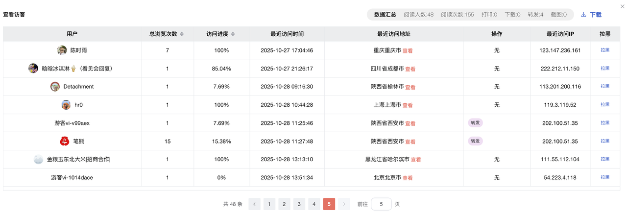 | 访问轨迹 | 单访客 IP、地域、进度、停留时长、操作记录 |