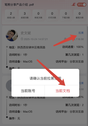 操作:访问轨迹 → 点击 拉黑 → 选择「文档拉黑」