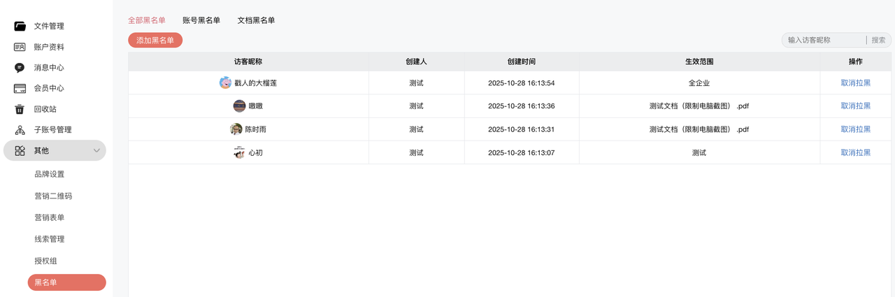 - 解除路径:文件管理 → 访问轨迹 → 已拉黑列表 → 取消拉黑