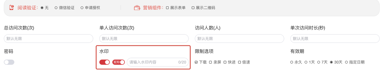 - 同时开启「下载 / 打印」时,落地文件无水印,如需硬水印请提前在本地加。