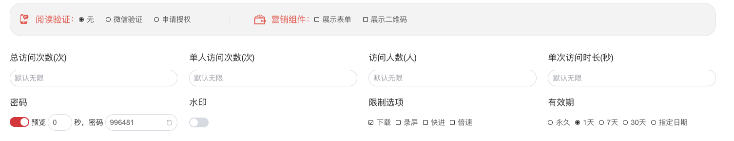 | 录屏 | 勾选后仅限手机微信播放,电脑端直接拦截 |