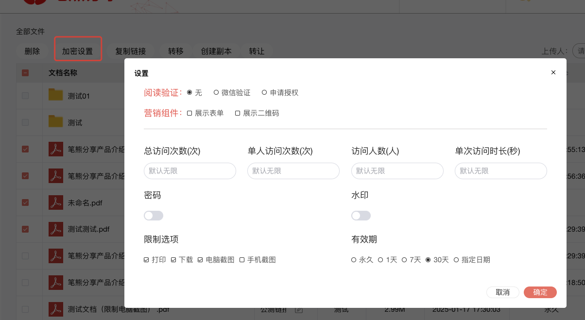 勾选多个文件 → 加密设置 → 弹窗内统一填写 → 确定即生效