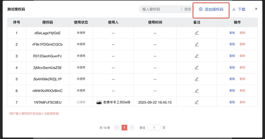授权组列表 → 修改 → 授权码