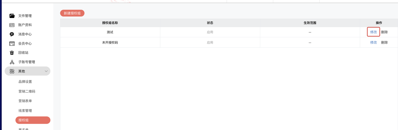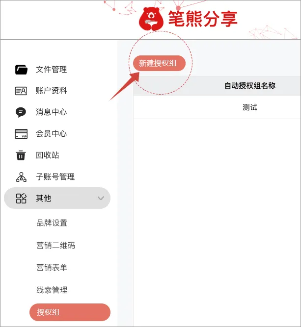 个人中心 → 其他 → 授权组 → 新建授权组
