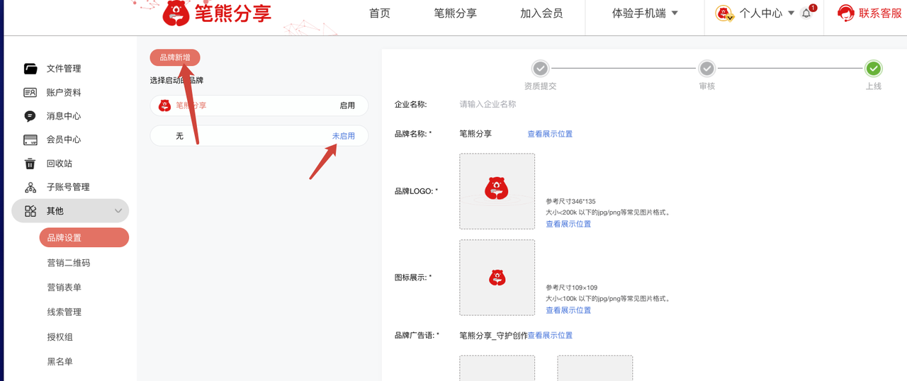 ⚠️ 注意:启用品牌设置后 域名与小程序名称无法更改,依然显示笔熊分享平台信息。